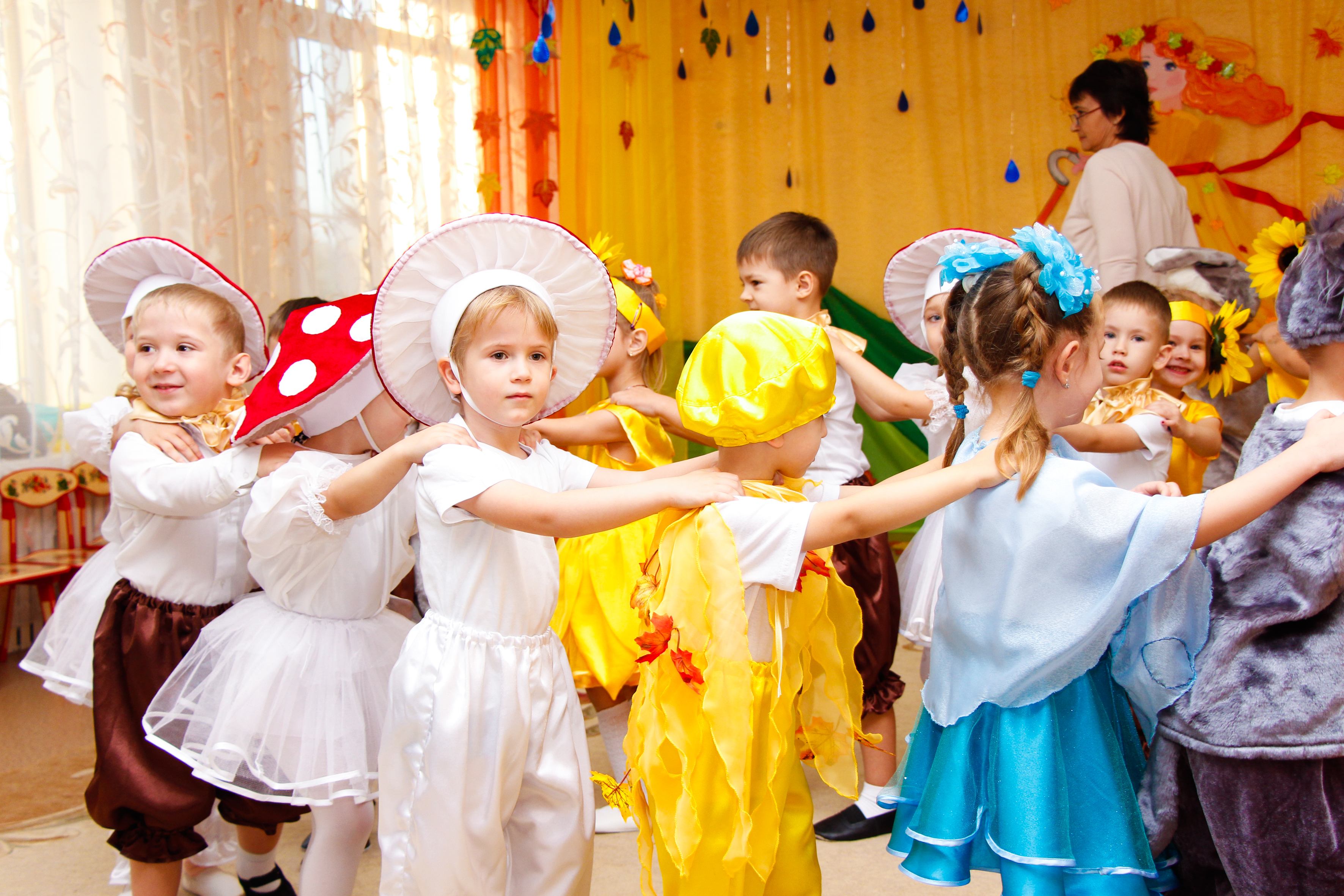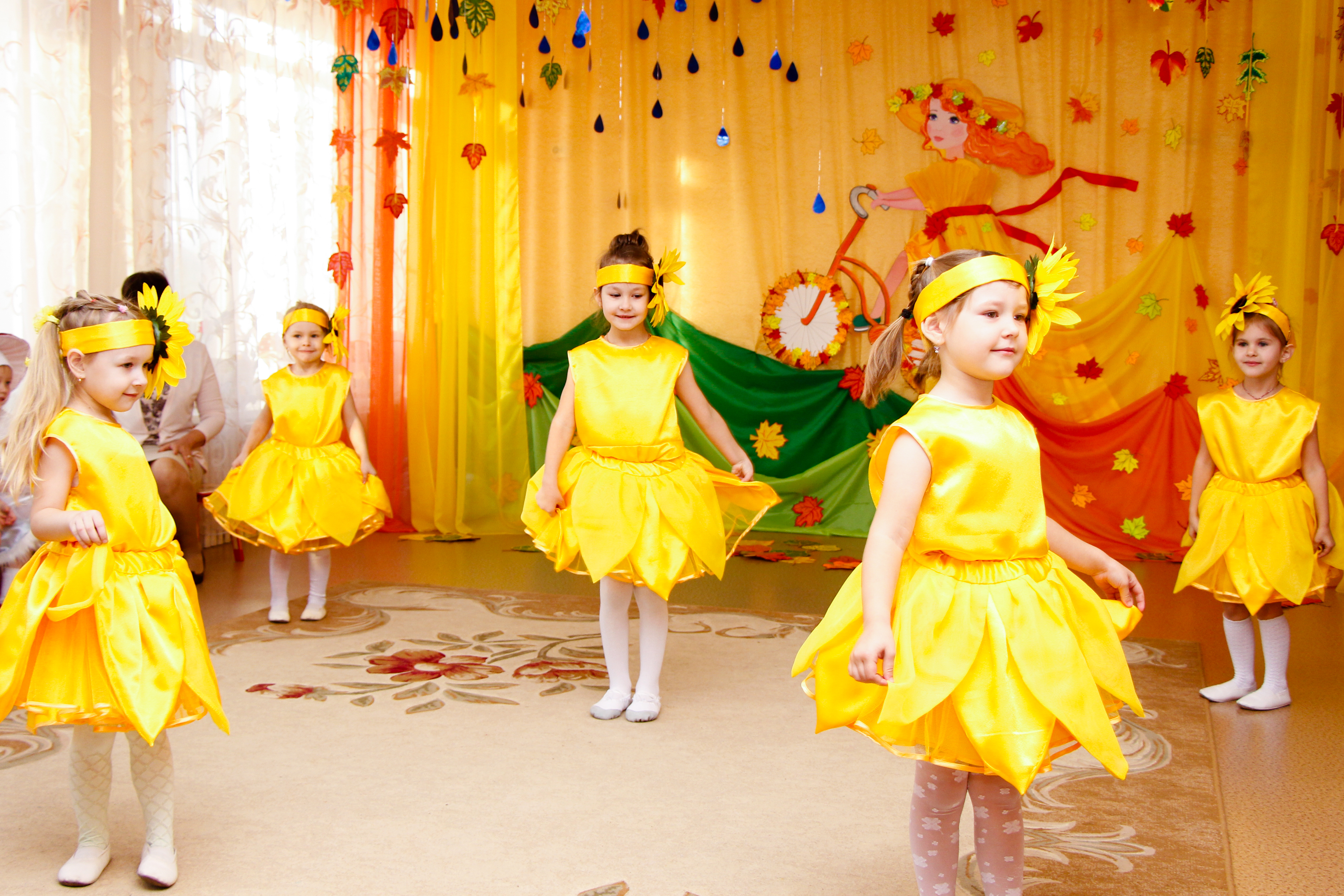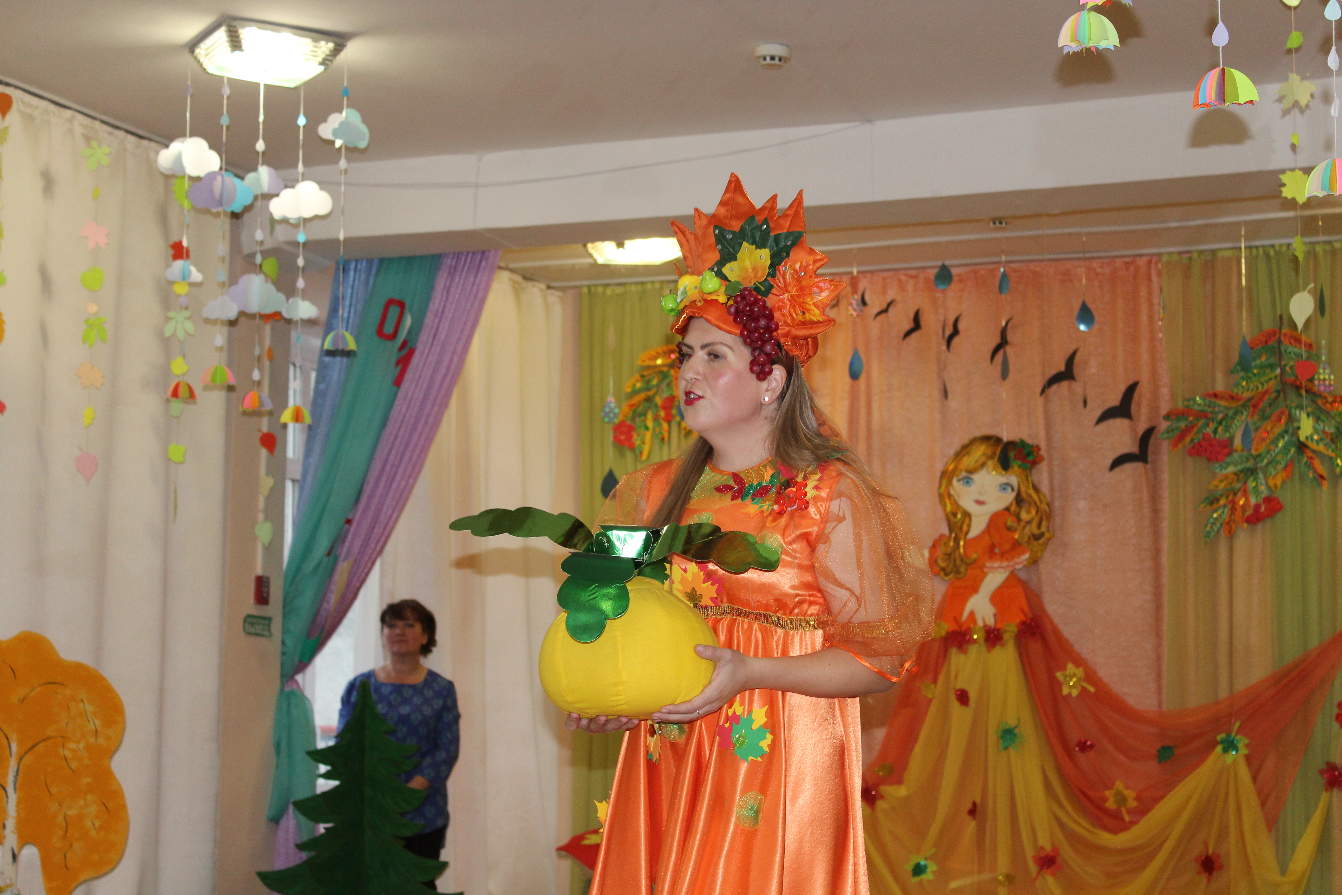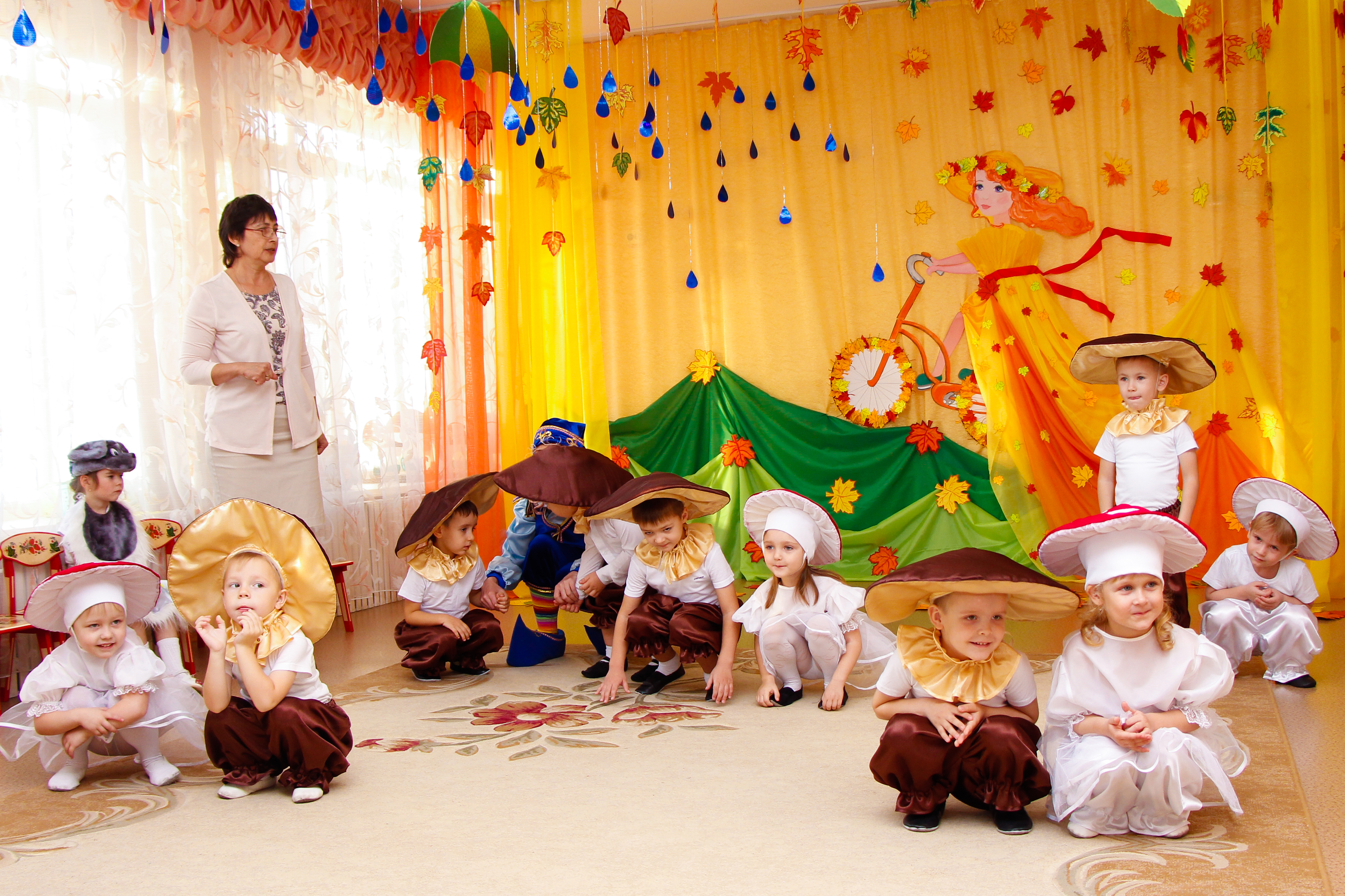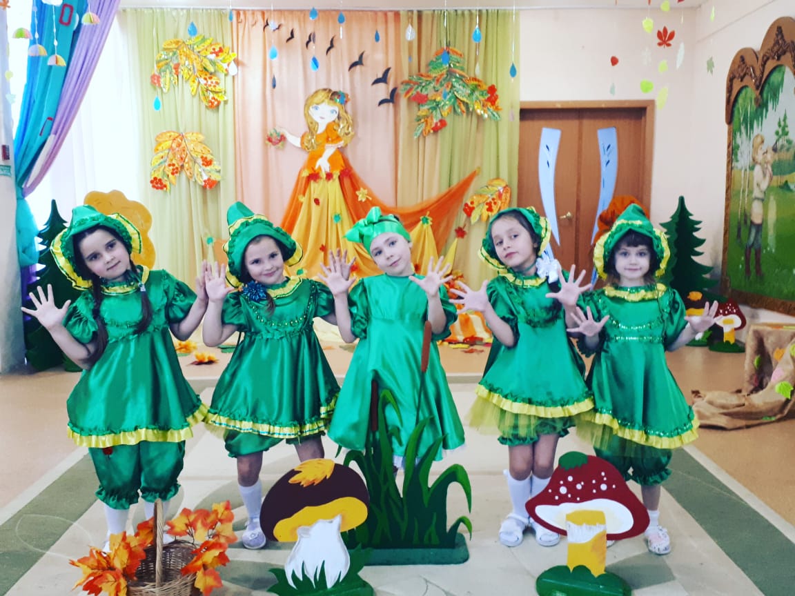 К празднику шились новые костюмы, воспитатели и родители подготовили атрибуты, инструменты и т.д. Родители группы №11 сделали для оформления зала гирлянды из тучек и осенних зонтиков.