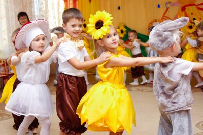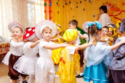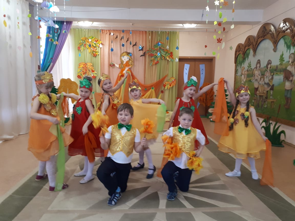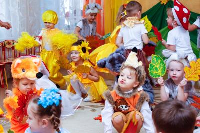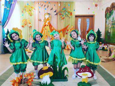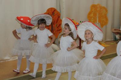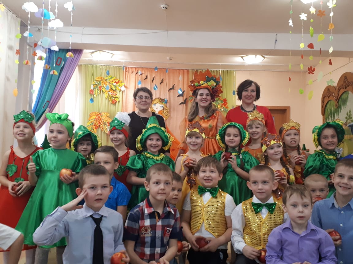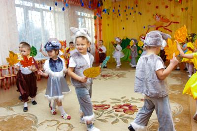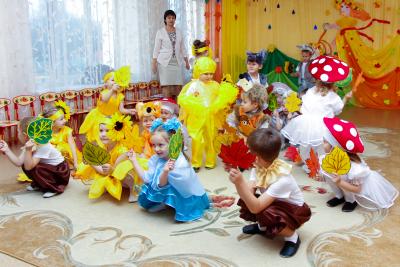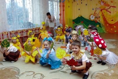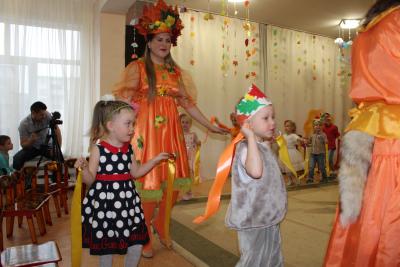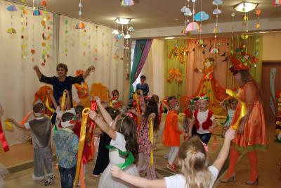 Осень – необыкновенно красивое время года. В нашем детском саду прошли праздники, посвященные этому прекрасному времени года. Дети пели, танцевали, исполняли сценки и стихи. Активное участие в подготовке атрибутов к празднику приняли родители. Дети средней группы №5 и №9 танцевали кленово-рябиновый вальс, где родители изготовили диадемки для танца, для девочек – рябинки, для мальчиков – кленовые листочки. На празднике родители и дети с удовольствием вместе играли в оркестре, а инструменты изготовили сами: барабанчики, орешки, «шумелочки». Всем было интересно! Дети подготовительной гркппы №8, прежде чем встретиться с Осенью, прошли разные испытания: победили Кикимору и Лешего, встретились с добрым ежиком, который загадывал детям загадки про грибы, побывали в гостях у Водяного. Под музыку «Разноцветная Осень» несколько детей исполнили танец с разноцветной тканью, напоминающей осенние краски, а лягушата веселой песенкой развеселили Водяного. Все встретились с Осенью, которая подарила детям волшебный арбуз, в нем было угощение для ребят – ароматные и сладкие яблоки.