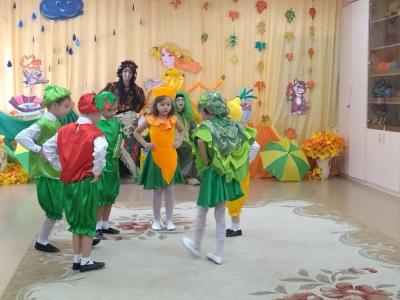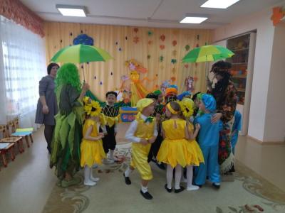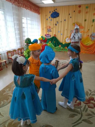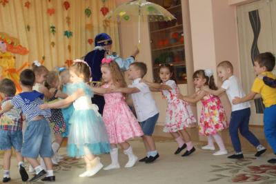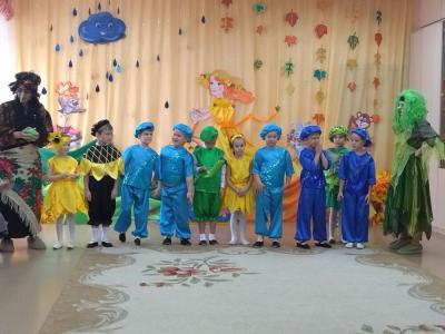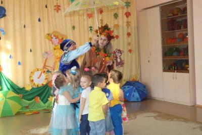 Детей старшей группы ждала удивительная встреча в Музыкальной студии Осеннего Дождя! Дождик вместе со своей подружкой Дождинкой устроили настоящий концерт для Осени: пели свою песню капельки - дождинки, задорно выступил «Овощной оркестр», осенний ветерок сыграл нежную мелодию на дудочке, все дети спели песни «Осенняя прогулка» и «Осень в гости к нам пришла». Вместе с героями дети играли в музыкальные и подвижные игры: «По лесным дорожкам», «Найди свой дождик», «Кто скорей убежит от дождя? «Поиграй с капельками», «Огуречная эстафета».