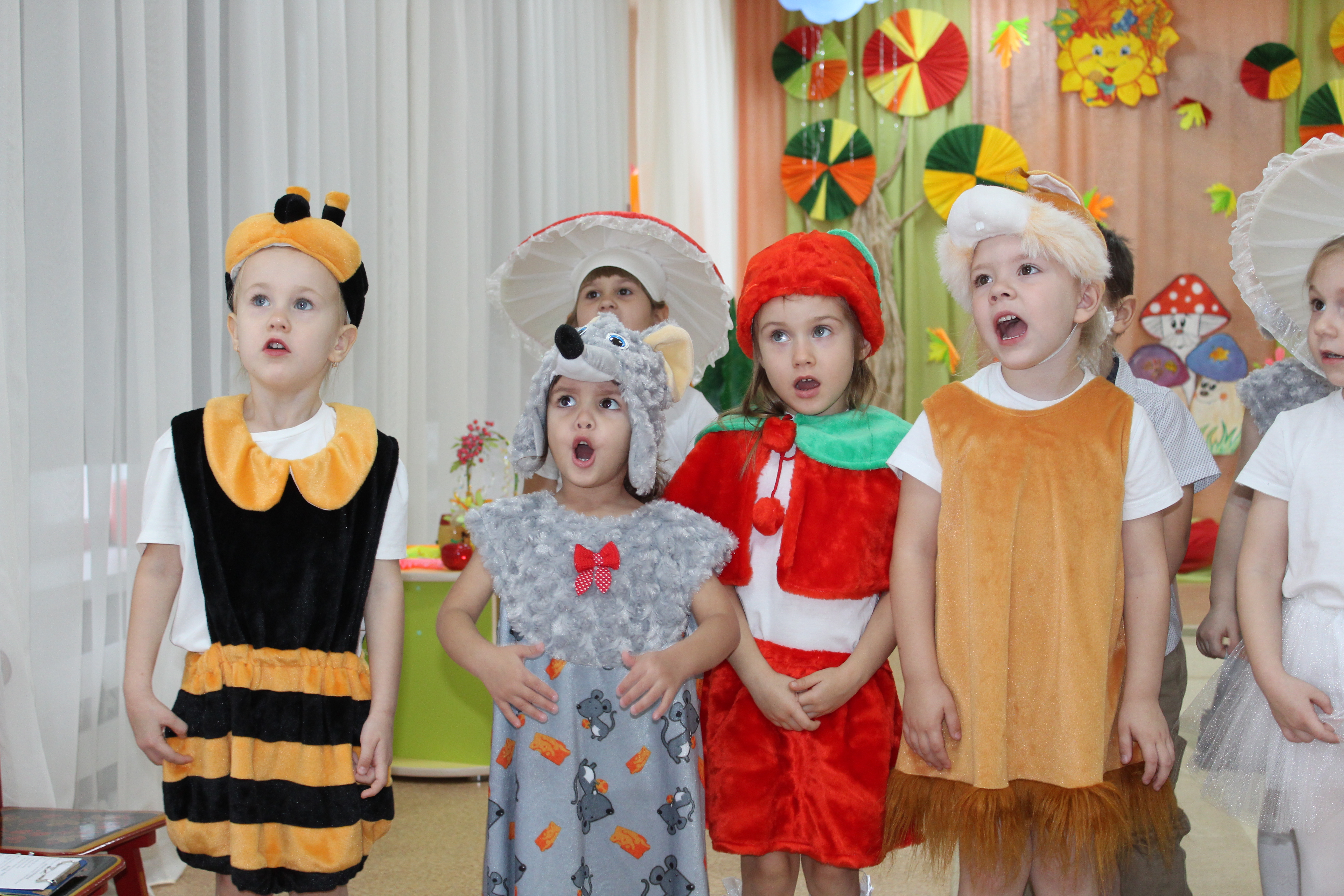 В средней группе волшебный листочек привел детей к ежику, с которым они пели, играли в веселые игры. За это Ежик подарил ребятам 3 волшебных яблочка, в каждом был свой секрет. Ну а когда пришла красавица-Осень, то детской радости не было предела!!! Осень встречали пчелки, ягодки, лесные, зверушки. Все пели и играли на лесной полянке!
