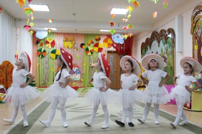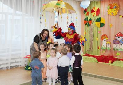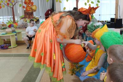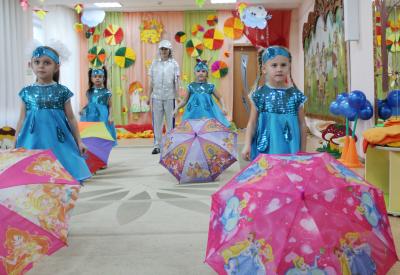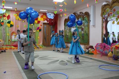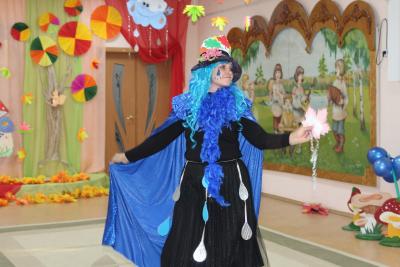 В старшей группе к детям пришел Дождик- веселый и озорной, он подарил детям чудесный зонтик, который перенес всех в лес, здесь ребята встретились со старичком-Боровичком. К детям приходила тетушка-Непогодушка, которая стала доброй и вернула ребятам на праздник Осень!!!
