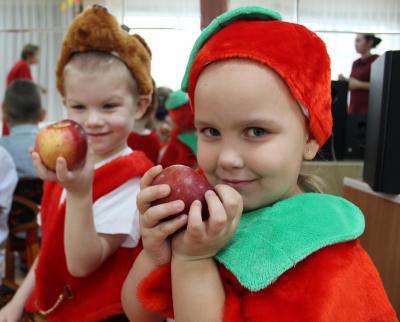 В конце праздника всех ребят ждал сюрприз - осенние яблочки, которые Осень спрятала то в волшебной тыкве, то в корзинке, то в воздушных шарах.