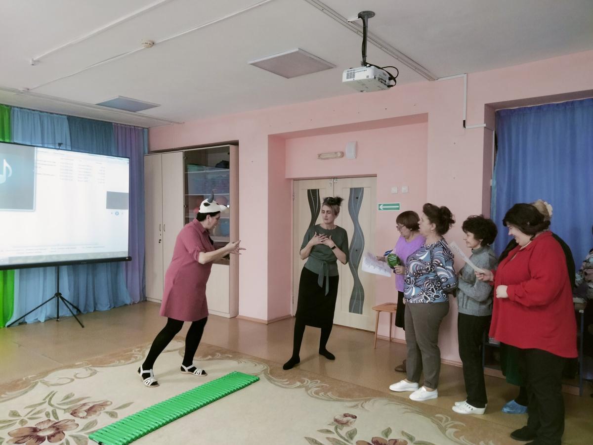 Семинар был насыщенным, музыкальные руководители выполняли разнообразные игровые и творческие задания, пели, танцевали и продемонстрировали свой артистические способности.